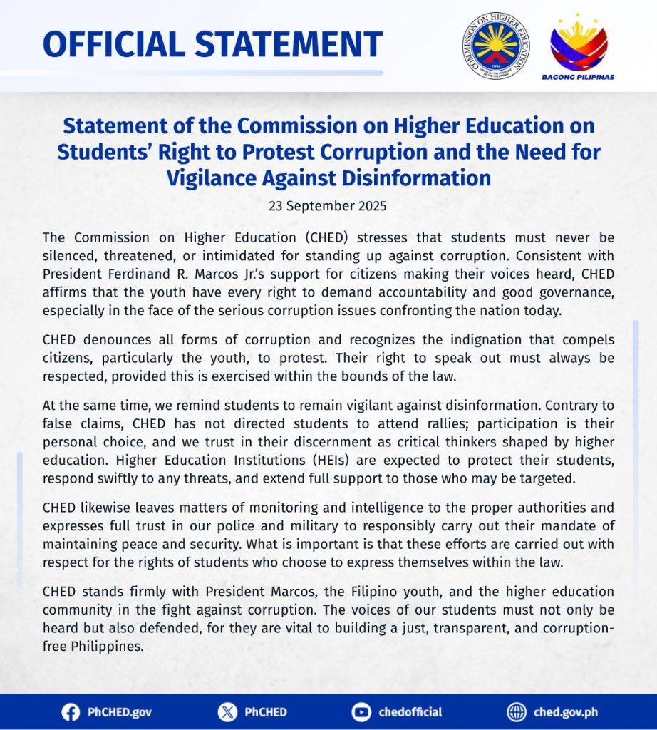 “CHED stands firmly with President Marcos, the Filipino youth, and the higher education community in the fight against corruption. The voices of our students must not only be heard but also defended, for they are vital to building a just, transparent, and corruption-free Philippines,” it added.