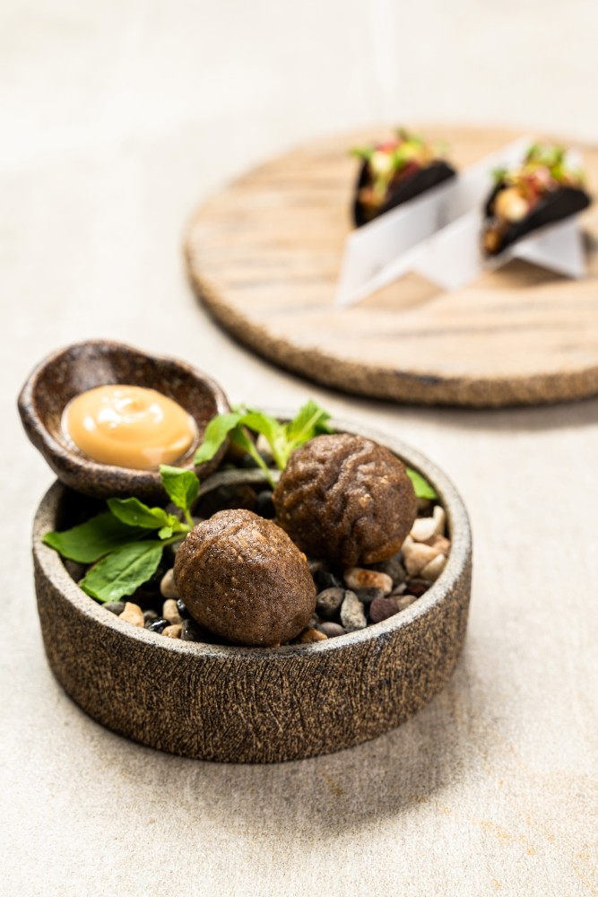Showcasing Alegria’s commitment to culinary innovation and cultural exploration, the menu is an invitation to interact with food in new ways, highlighted by the use of a custom-made balisong to slice tender smoked Iberico pork, signifying a blend of tradition and modernity. The restaurant’s ambience, with its contemporary art and an impressive grill, complements the interactive dining experience, creating an atmosphere that is “maximalist and unapologetically Alegria.”